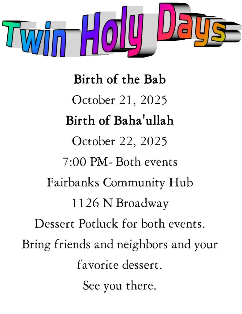 The Baha’i Faith has two Founders – the Bab and Baha’u’llah — whose missions complement each other, whose majestic Shrines now stand in the twin cities of Haifa and Akka in northern Israel, and whose birthdays according to the Islamic lunar calendar fell on consecutive days, but according to the Gregorian calendar were celebrated on October 20 and November 12, respectively. With the implementation of the Badi calendar, these days will now be celebrated as twin holy days, one falling immediately after the other.